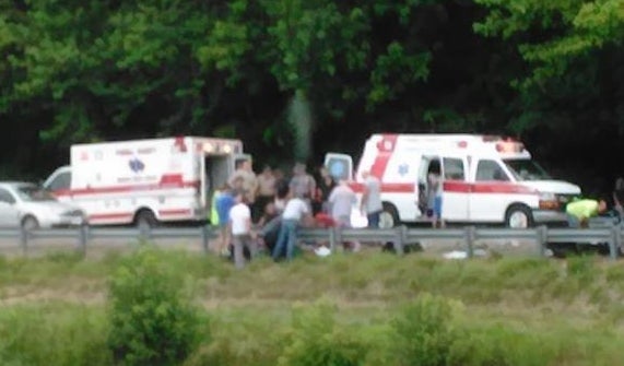 The roadside photo shows a crowd gathered around a motorcycle crash victim. Above the first responders’ heads hovers a transparent shadow eerily resembling a human figure.