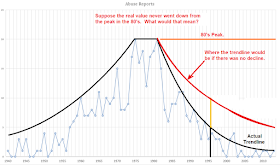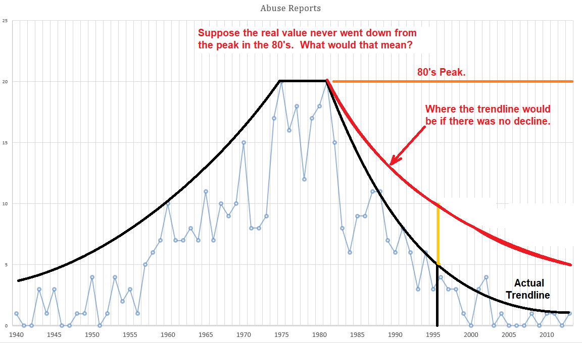Suppose the abuse never subsided from the 1980s peak. Using the report % data from the John Jay report, we can estimate what the reported abuse trendline would be if there was no real decline.